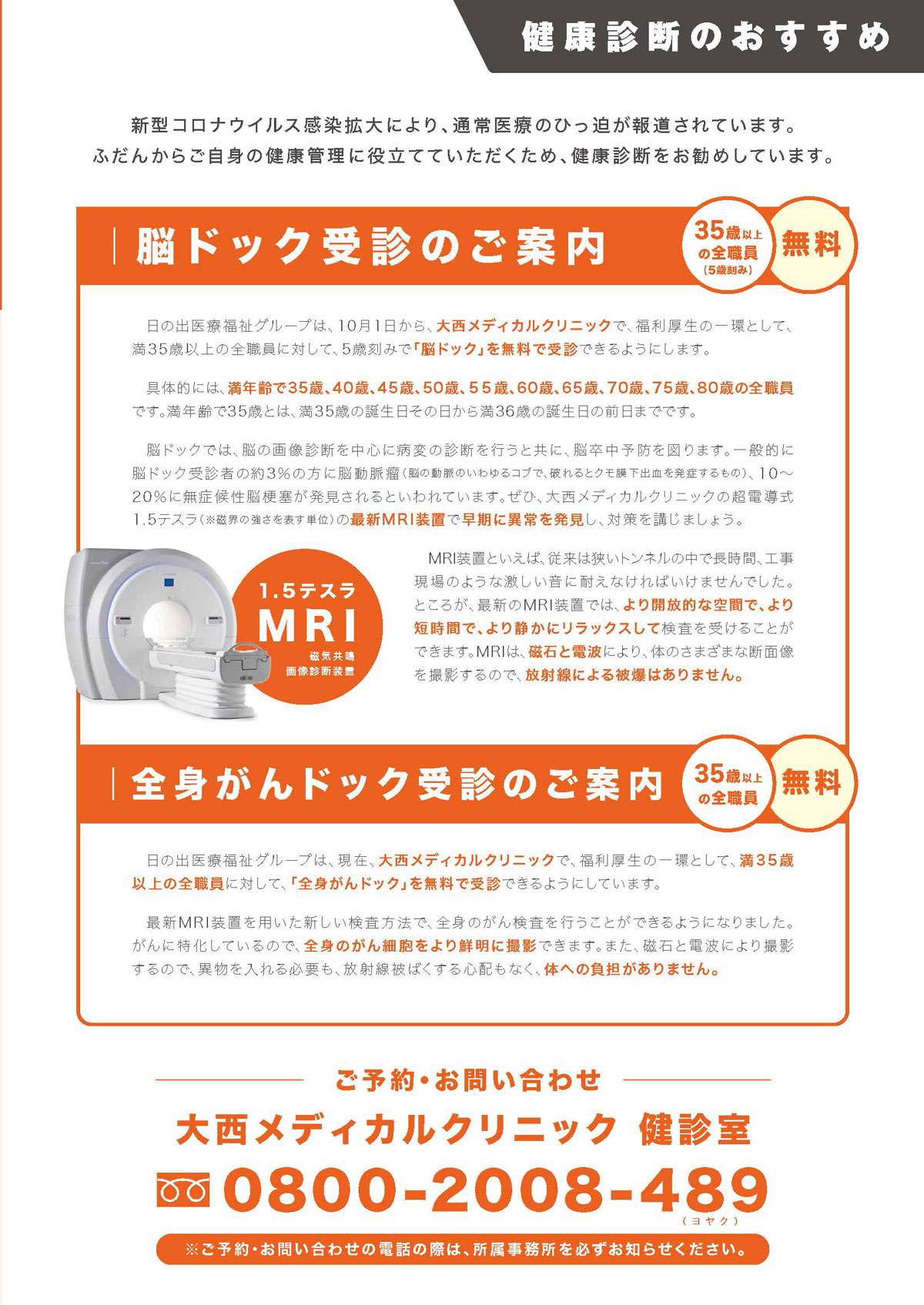 35歳以上の全職員(※)の方は、大西メディカルクリニックでの最新MRI検査が無料で受けられます。
