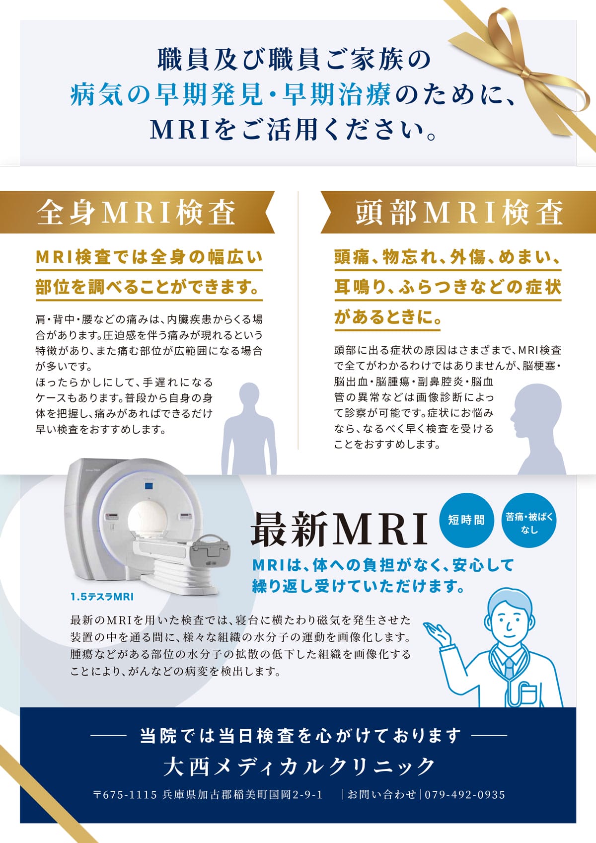 職員及び職員ご家族の病気の早期発見・早期治療のために、大西メディカルクリニックMRIをご活用ください。