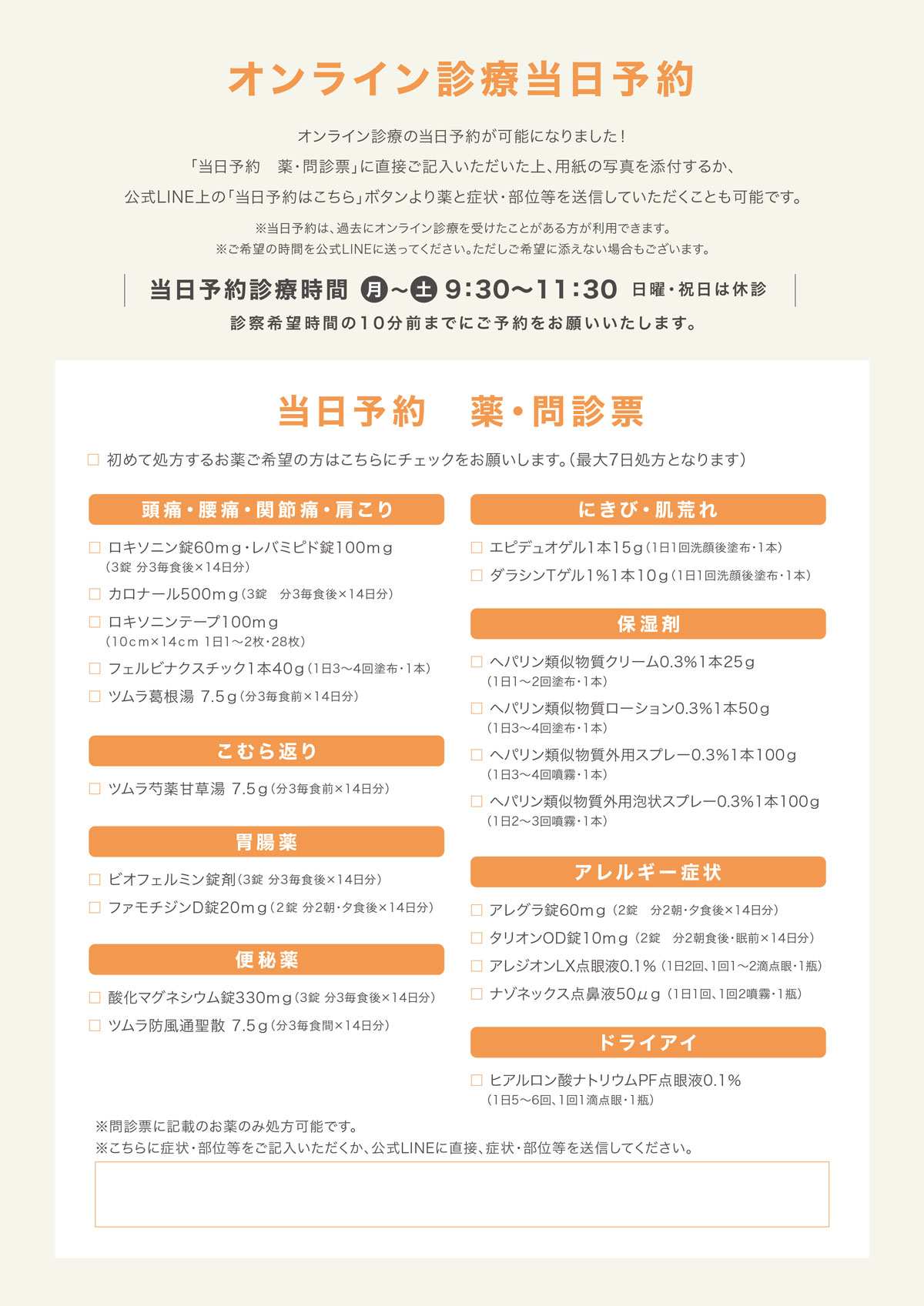 2024.04.08 掲載 【2024年度版】大西メディカルクリニックオンライン診療の案内 PDFはこちら 大西メディカルクリニックのオンライン診療がリニューアルされました! スマホで診療を受けられるのは変わらず、より便利に、当日予約が受付可能になっています(※日時の指定あり)。 ぜひご確認ください。
