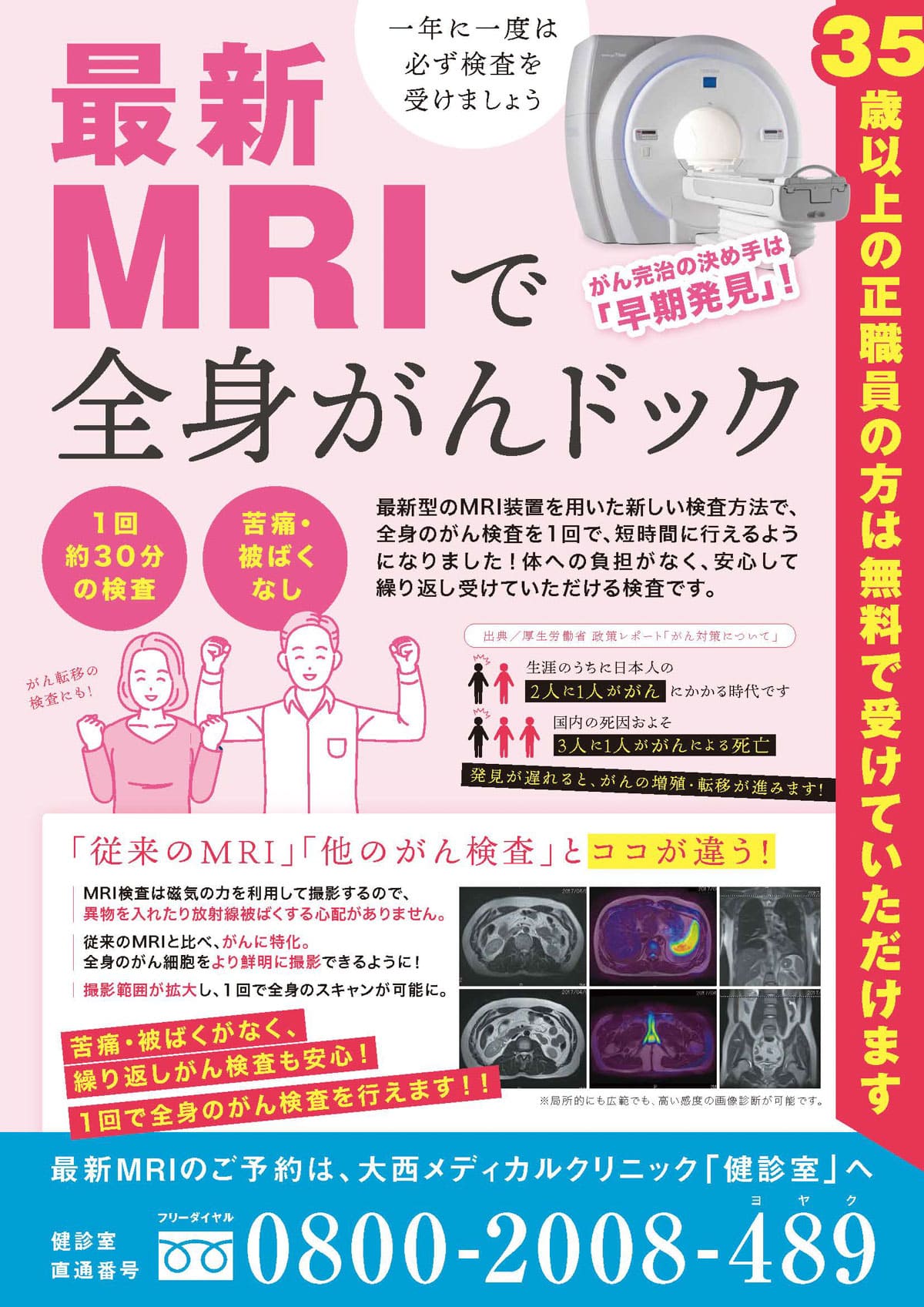 大西 大西メディカルクリニック MRI無料 2022.10.25 掲載 35歳以上の全職員(※)の方は、大西メディカルクリニックでの最新MRI検査が無料で受けられます。 全身のがん検査を1回30分で行えるようになりました。 身体への負担がなく、安心して受けていただける検査です。 がん完治の決 […] 詳しく見る
