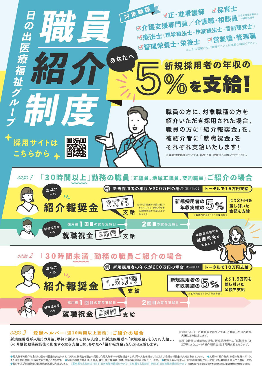 その他 職員紹介制度の案内 2022.11.25 掲載 日の出医療福祉グループでは職員紹介制度を設けています。 グループ職員によって紹介された人材の採用が決まった時に、紹介者に「紹介報奨金」、紹介された応募者に「入職お祝い金」を支給しています。制度に関するご質問や募集中職種の […] 詳しく見る