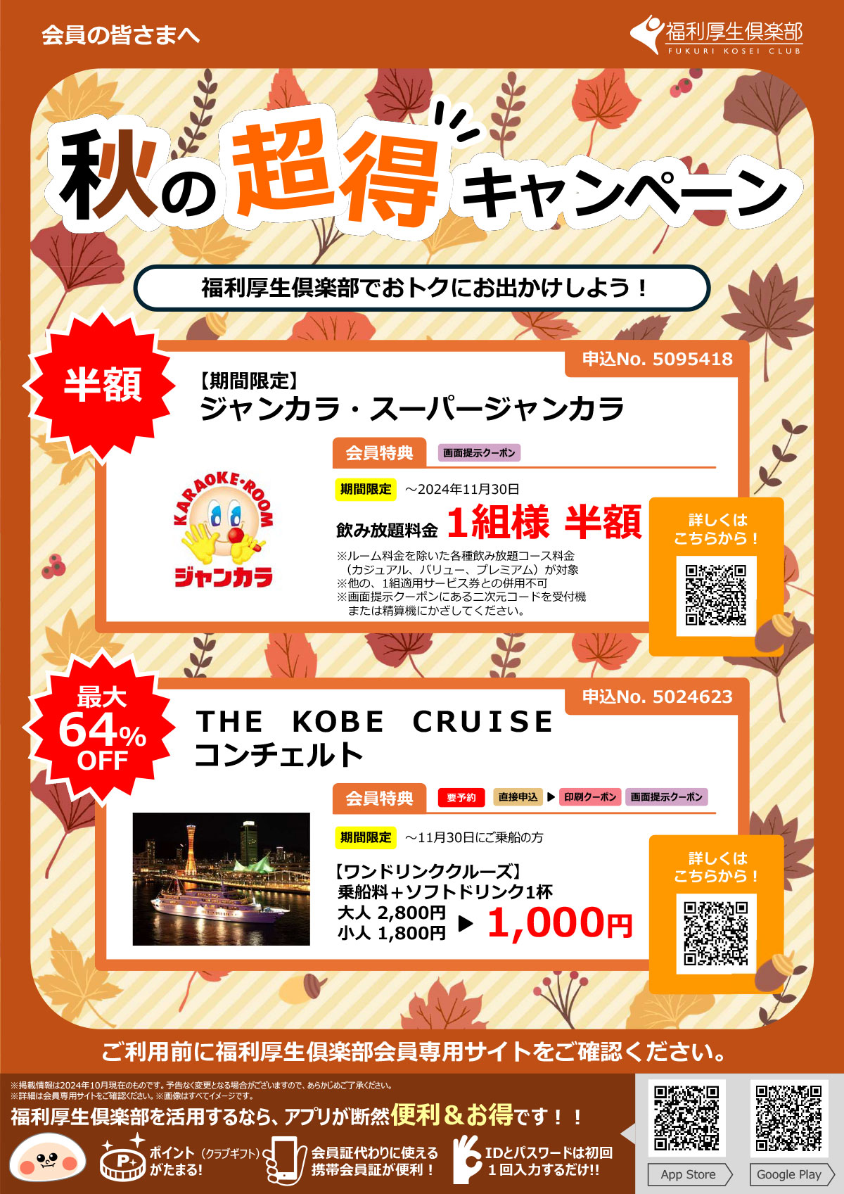 リロクラブ会員限定のイベント情報をご案内します。 PDFのQRコードをよみこみ、会員専用サイトで申込方法・利用方法・特典内容をご確認のうえ、お申し込みください。 ① 秋の超得キャンペーン ・ジャンカラ・スーパージャンカラ […]